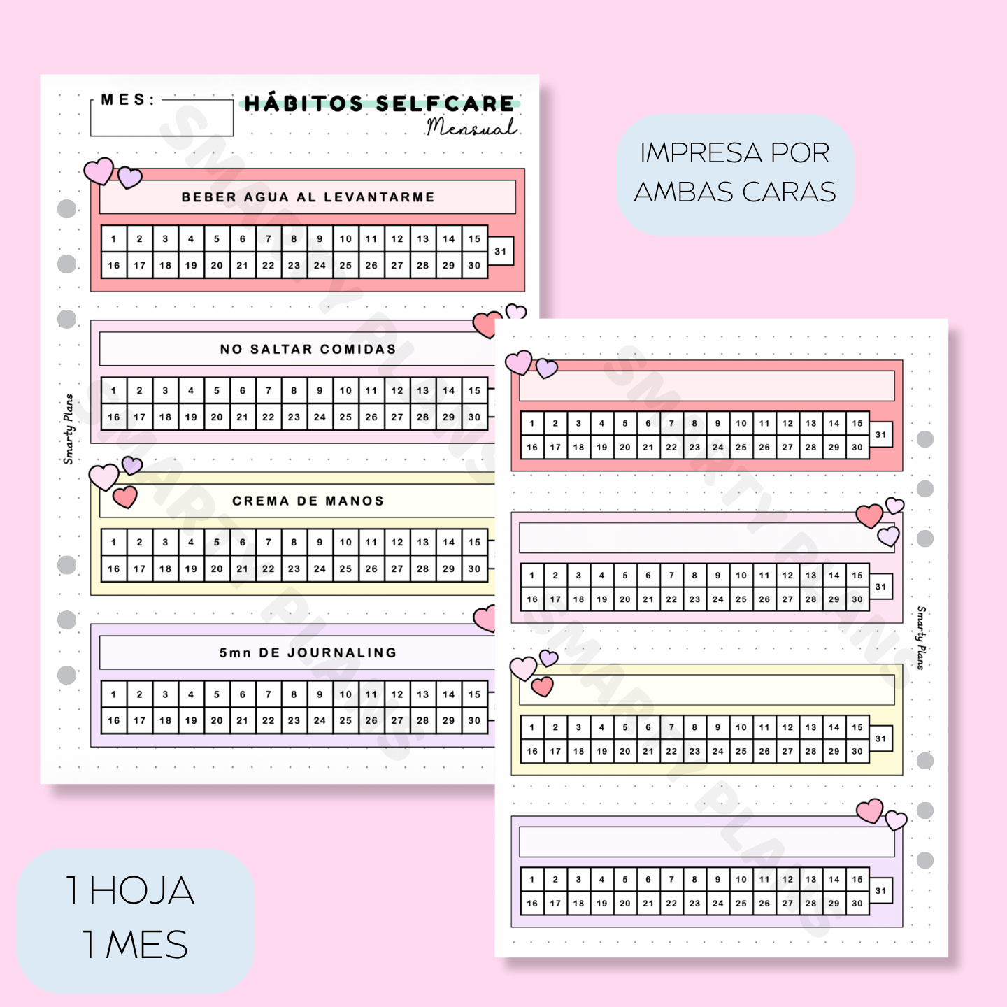 1 Hoja: Plantilla mensual para hacer seguimiento diario hábitos selfcare / autocuidado. Incluye algunos hábitos fundamentales, y la cara trasera de la plantilla tiene espacio para que tú elijas otros 4 hábitos para el mes. La plantilla sirve para hacer seguimiento diario durante todo un mes.